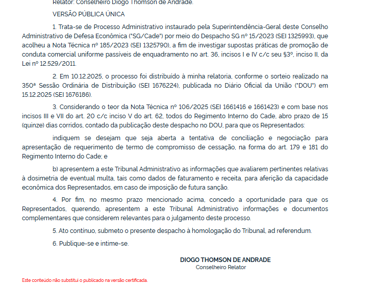 O processo foi distribuído ao conselheiro relator Diogo Thomson de Andrade em dezembro de 2025. Com a publicação do despacho, o Cade estabeleceu prazo de 15 dias corridos para que as entidades envolvidas informem se desejam participar de tentativa de diálogo institucional, por meio da apresentação de proposta de Termo de Compromisso de Cessação, instrumento previsto no regimento interno do órgão. Esse instrumento permite que os investigados se comprometam a interromper a conduta questionada, podendo resultar na suspensão ou encerramento do processo.