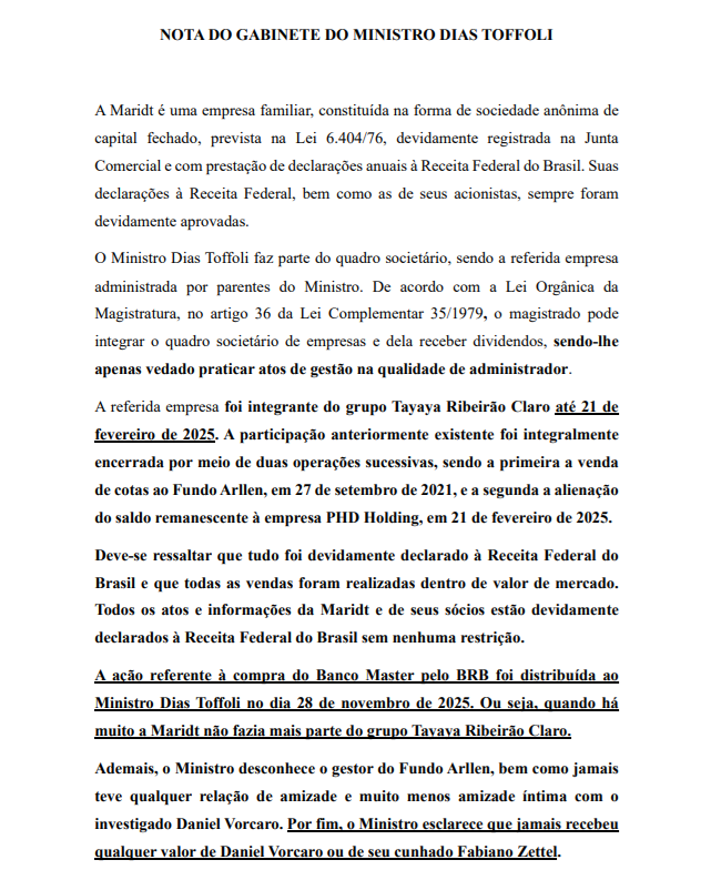 O ministro Dias Toffoli, do Supremo Tribunal Federal (STF), divulgou nesta quarta-feira (11/2) uma nota oficial em que assume ser sócio da Maridt, empresa familiar que vendeu participações no resort Tayayá, localizado no Paraná, para Fabiano Zettel, cunhado de Daniel Vorcaro, dono do Banco Master. Toffoli é relator de ações que envolvem o grupo econômico do empresário na Corte.