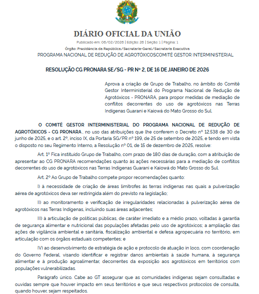 O Governo Federal instituiu um Grupo de Trabalho para propor medidas de mediação de conflitos relacionados ao uso de agrotóxicos nas Terras Indígenas Guarani e Kaiowá, no Mato Grosso do Sul. A decisão foi oficializada por meio de resolução do Comitê Gestor Interministerial do Programa Nacional de Redução de Agrotóxicos, publicada no Diário Oficial da União (DOU) desta quinta-feira (6/1).