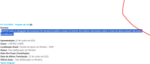 Foi com essa preocupação que ele apresentou o projeto de lei 413/2025, que obriga as empresas de transporte público a anexarem no interior dos ônibus um informativo sobre o crime de abuso sexual. Outro exemplo é o PL 416/2025, que trata do mesmo tema, mas dessa vez prevendo sanções administrativas a serem aplicadas a casos de abuso e assédio sexual em locais públicos.