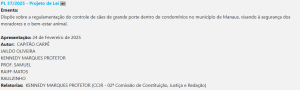 Ordem nas relações sociais são também preocupações do vereador, como fica claro nos objetivos do projeto de lei 37/2025, que estabelece regras para a criação de cães de grande porte em condomínios de Manaus, e no PL 168/2025, que cria o Programa de Combate ao Uso de Drogas nos Terminais de Ônibus.