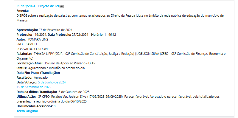 Projeto de Lei nº 119/2024 (em tramitação), que propõe a realização de palestras nas escolas públicas municipais sobre os direitos da pessoa idosa, com foco na conscientização sobre o Estatuto do Idoso e práticas de respeito e proteção à população idosa.