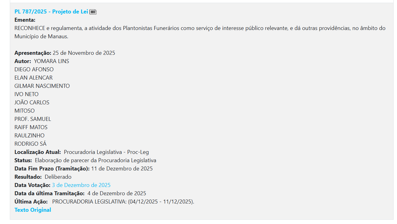 Dos cinco projetos de lei apresentados ao Parlamento municipal em um único dia (17 de novembro de 2025), quatro foram arquivados. O único projeto deliberado foi o de nº PL 787/2025, que trata da regulamentação de plantonistas funerários e reconhecimento da atividade como serviço público. A proposta está sob análise na Casa.