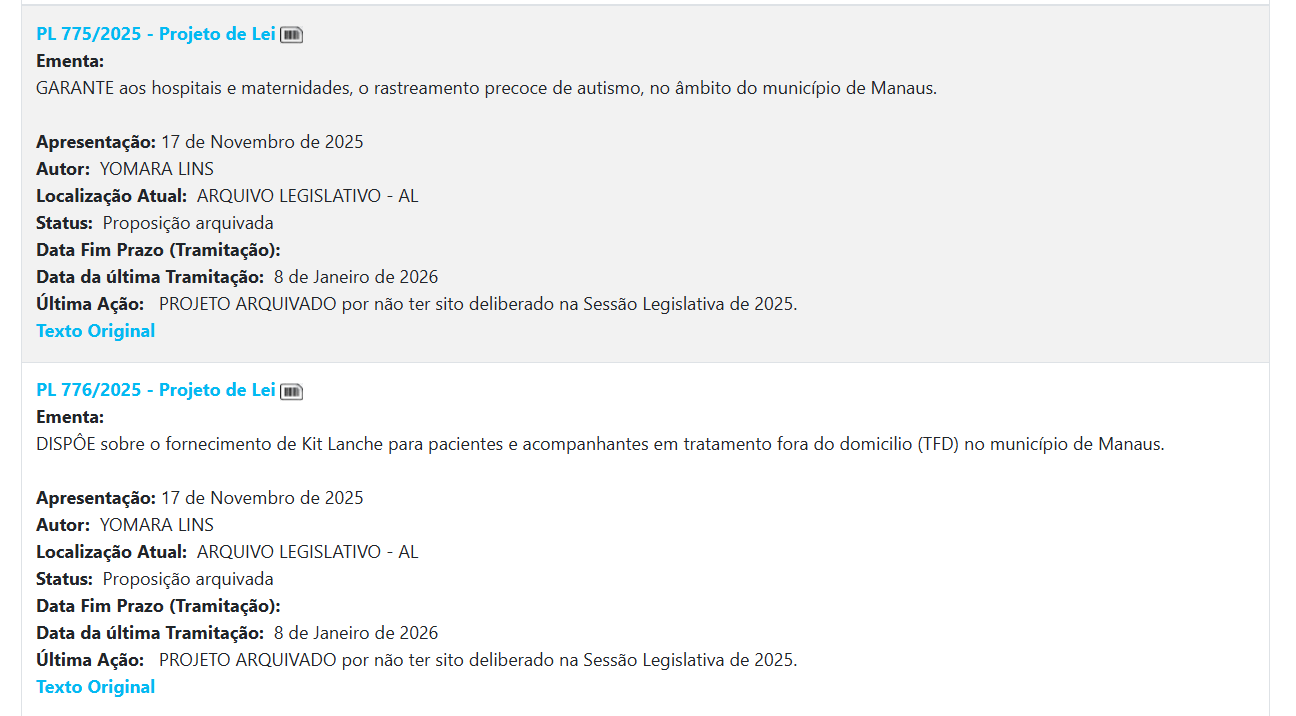 Apesar de estar em seu segundo mandato, a vereadora passou a maior parte de 2025 sem apresentar projetos de lei. Levantamento publicado pela Rede Onda Digital, até agosto do ano passado, apontou que Yomara Lins não havia protocolado nenhuma proposta na Casa. Somente após a divulgação dos dados é que cinco projetos foram apresentados, todos no mesmo dia. Destes, quatro acabaram arquivados. A parlamentar protocolou apenas um projeto de resolução.