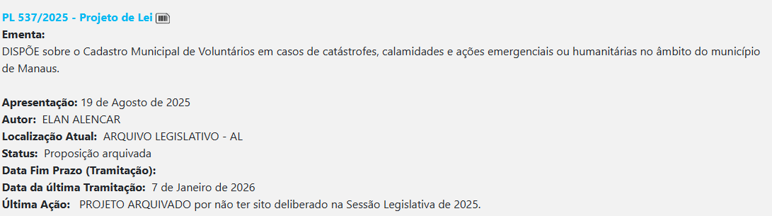 O oitavo PL apresentado pelo vereador trata da adoção de “medidas para assegurar a proteção e a assistência integral a crianças e adolescentes em situações de calamidade pública no município de Manaus”. Este projeto segue em tramitação na Comissão de Constituição e Justiça à espera do parecer do relator Allan Campelo (Podemos).