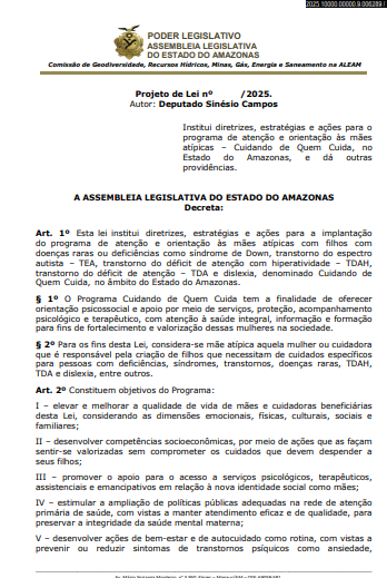 PL 157/2025 – Projeto de Lei Ordinária: institui diretrizes, estratégias e ações para o programa de atenção e orientação às mães atípicas – Cuidando de Quem Cuida, no Estado do Amazonas, e dá outras providências.