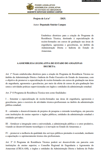 PL 922/2025 – Projeto de Lei Ordinária Etiqueta Individual: estabelece diretrizes para a criação do Programa de Residência Técnica, destinado à especialização de recém-formados em cursos de graduação nas áreas de engenharia, agronomia e geociências, no âmbito da Administração Direta e Indireta do Estado do Amazonas.