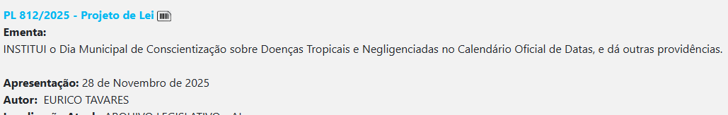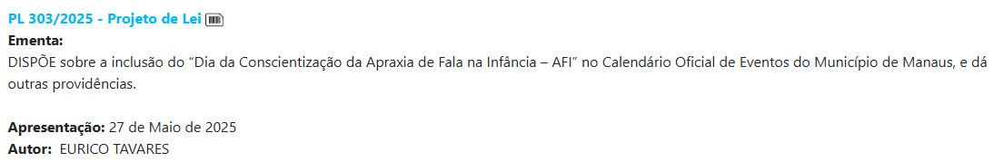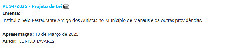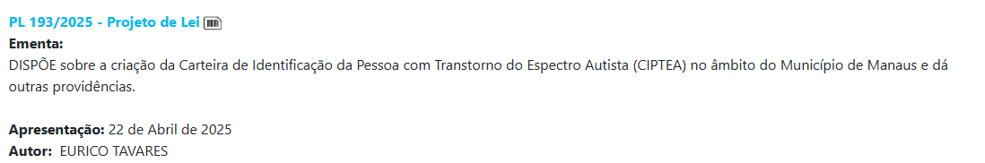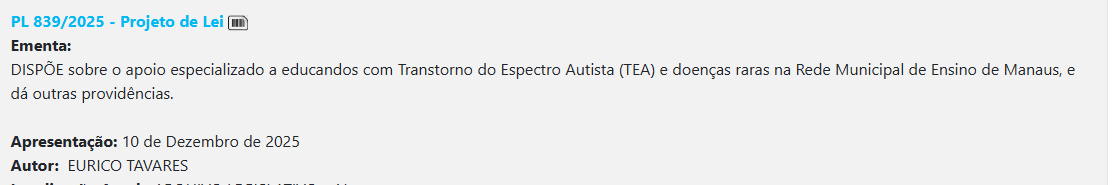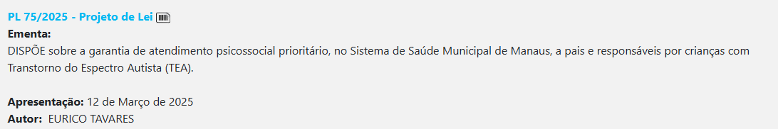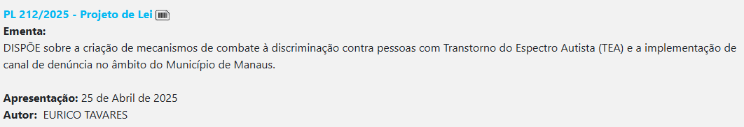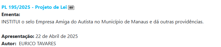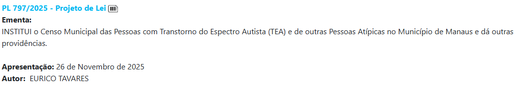Os três projetos de resolução protocolados por Eurico Tavares abordaram diferentes temas. O PR nº 10/2025, por exemplo, teve como foco principal a causa do TEA, tema recorrente em sua produção legislativa. O projeto prevê a criação, no âmbito da Câmara Municipal de Manaus, da Frente Parlamentar em Defesa da Pessoa com Transtorno do Espectro Autista e de Outras Pessoas Atípicas.