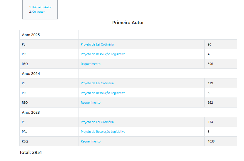Nesse ponto, ao conferir no SAPL, o deputado estadual coleciona 2.951 matérias como primeiro autor, até o momento. Desse número, 2.556 são somente requerimentos, colecionados nesses três anos de mandato.