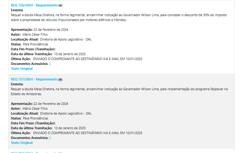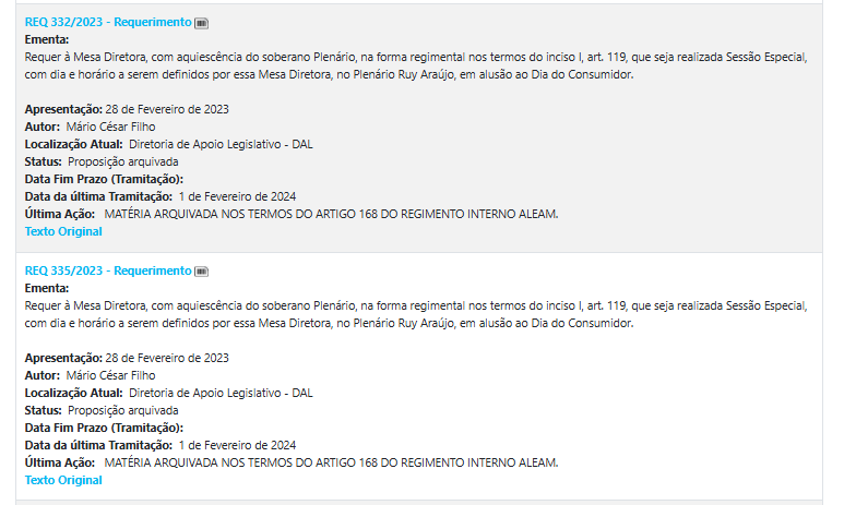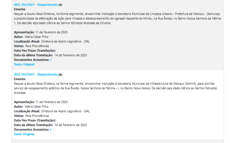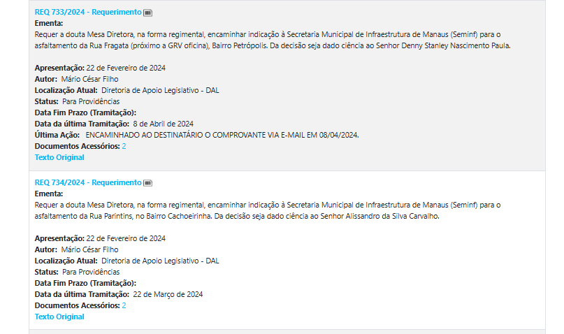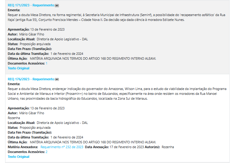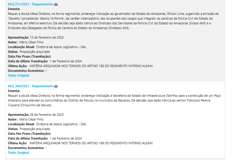 No ano de 2023, 1.038 requerimentos foram entregues. Parte deles foram arquivados, segundo o sistema da Casa Legislativa. Entre eles, o parlamentar pedia ao governo do Amazonas a construção de um poço artesiano no município de Barcelos, e o recapeamento asfáltico de uma rua no bairro Cidade Nova 2.