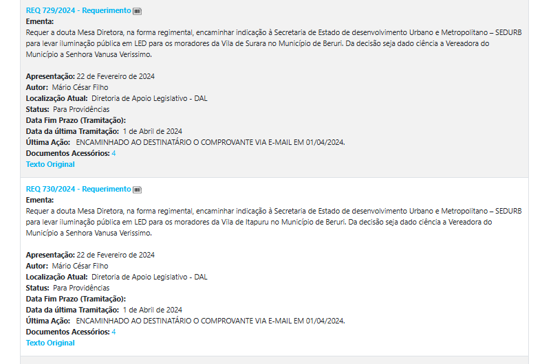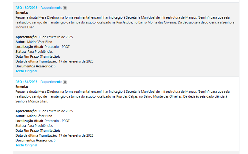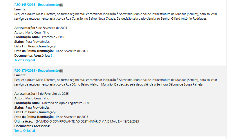 O cenário se repete em 2025, onde foram apresentados 596 requerimentos, no total, até a publicação desta análise. O número pode aumentar até o fim do ano. A maioria dos requerimentos, estão para Providências na Casa Legislativa, seguindo em tramitação.