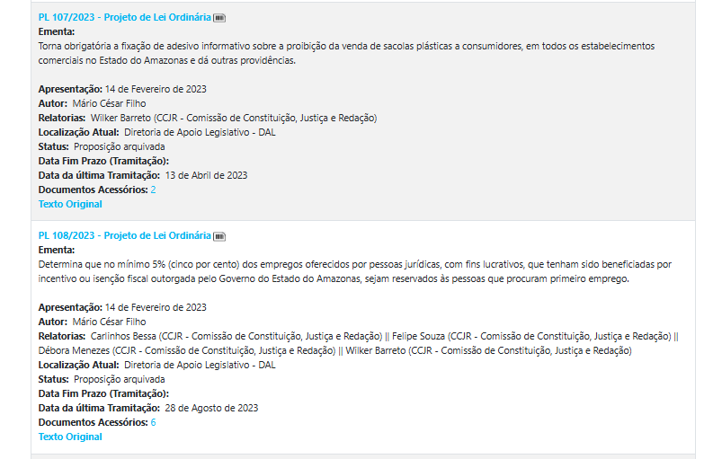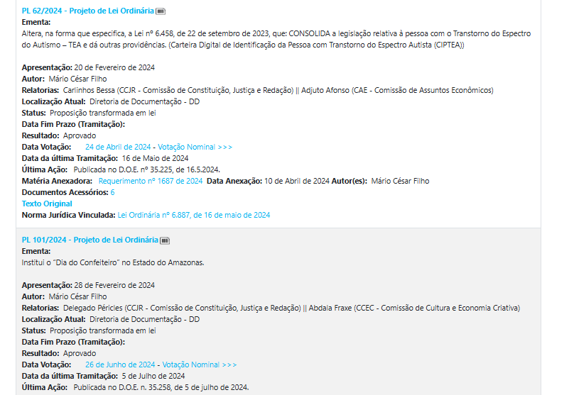 Como de praxe no levantamento, a produtividade também é observada pela quantidade de projetos de lei ordinárias protocoladas na Aleam. No ano de 2023, o deputado estadual apresentou 174 matérias, destas, algumas foram arquivadas e outras viraram leis.