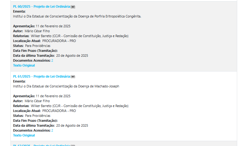 Em 2025, foram protocolados 90 propostas, que seguem em tramitação. O que mais chama a atenção são as matérias que reverenciam datas comemorativas relacionadas à conscientização de determinados temas.