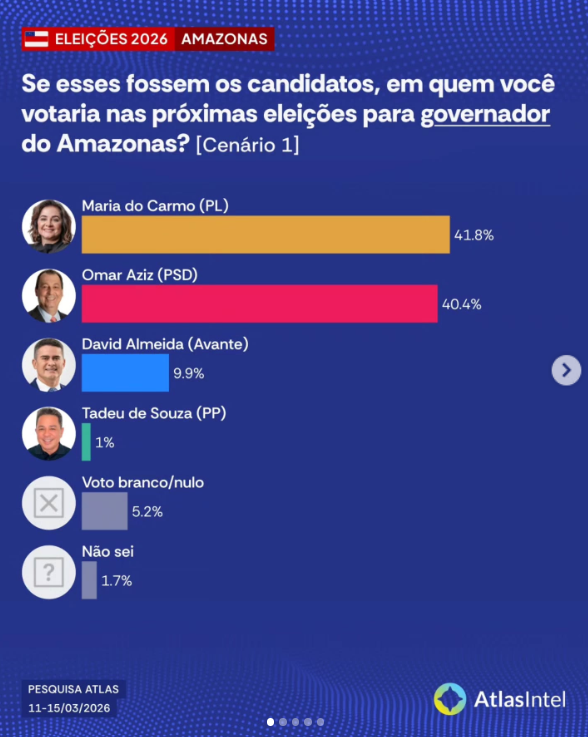 Pesquisa do instituto AtlasIntel divulgada nesta quarta-feira (18/3) aponta empate técnico entre a empresária Maria do Carmo Seffair (PL) e o senador Omar Aziz (PSD) na corrida pelo governo do Amazonas.