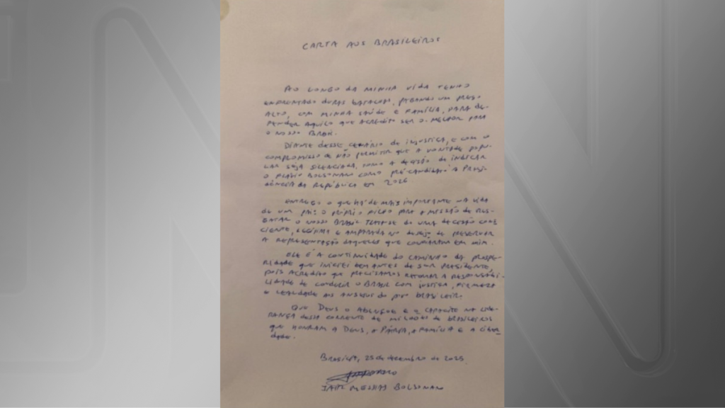 O ex-presidente Jair Bolsonaro (PL) divulgou, nesta quinta-feira (25/12), uma carta escrita à mão na qual reafirma a indicação do senador Flávio Bolsonaro (PL-RJ) como pré-candidato à Presidência da República em 2026. A carta foi lida por Flávio a jornalistas na calçada do hospital onde o ex-chefe do Executivo está internado para uma cirurgia.