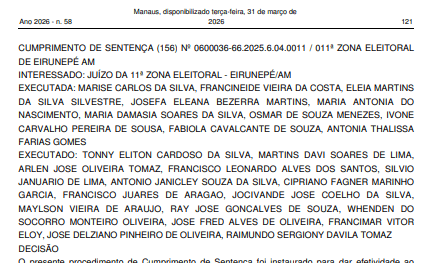 A medida consta no cumprimento de sentença nº 0600036-66.2025.6.04.0011, publicado em 6 de abril de 2026, e foi assinada pelo juiz eleitoral Roberto Hermidas de Aragão Filho, da 11ª Zona Eleitoral. A decisão segue entendimento do Tribunal Regional Eleitoral do Amazonas, que reconheceu fraude à cota de gênero no pleito.