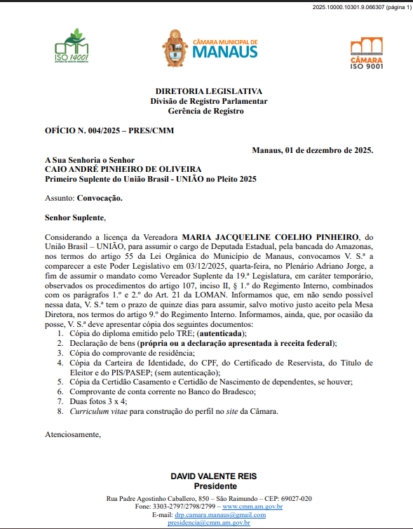 O presidente da Câmara Municipal de Manaus (CMM), David Reis (Avante) convocou o o secretário de Estado de Cultura e Economia Criativa, Caio André (União Brasil), para assumir temporariamente o mandato de vereador a partir de quarta-feira (3/12), em sessão no Plenário Adriano Jorge. A convocação ocorre após a vereadora Jaqueline Pinheiro (União Brasil) solicitar licença para exercer o cargo de deputada estadual pela bancada do Amazonas.
