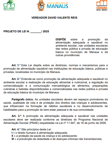 Durante a busca, de autoria de David Reis (Avante), presidente da Câmara Municipal de Manaus (CMM), foram encontrados poucos Projetos de Lei (PL) que reforçam o compromisso com a promoção da saúde e da qualidade de vida de crianças e adolescentes em escolas públicas e privadas de Manaus.