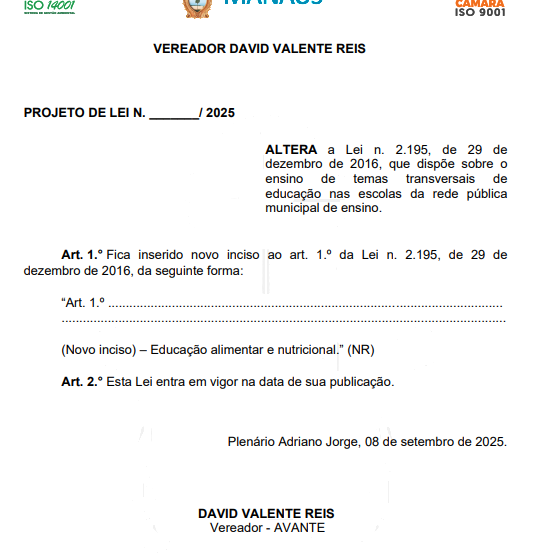 O segundo Projeto de Lei, com o número 592/2025, altera a Lei Municipal nº 2.195/2016, que trata dos temas transversais no currículo das escolas da rede pública municipal. A proposta insere a educação alimentar e nutricional como novo tema a ser abordado de forma contínua no processo de ensino aprendizagem.