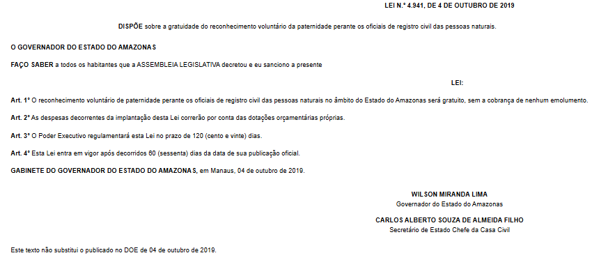 São de autoria do deputado: as Leis nº 4.941/ 2019, que garante gratuidade no reconhecimento voluntário de paternidade;