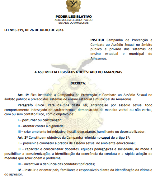 A de nº 6.319/2023, que institui a Campanha de Prevenção e Combate ao Assédio Sexual nos sistemas de ensino estadual e municipal;