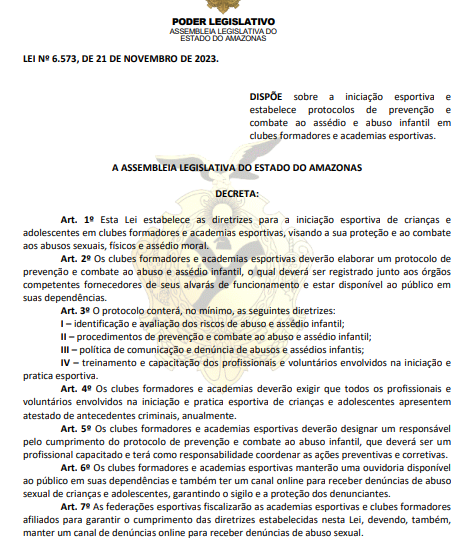 E a de nº 6.573/2023, que estabelece protocolos de prevenção e combate ao assédio e abuso infantil em clubes formadores e academias esportivas.