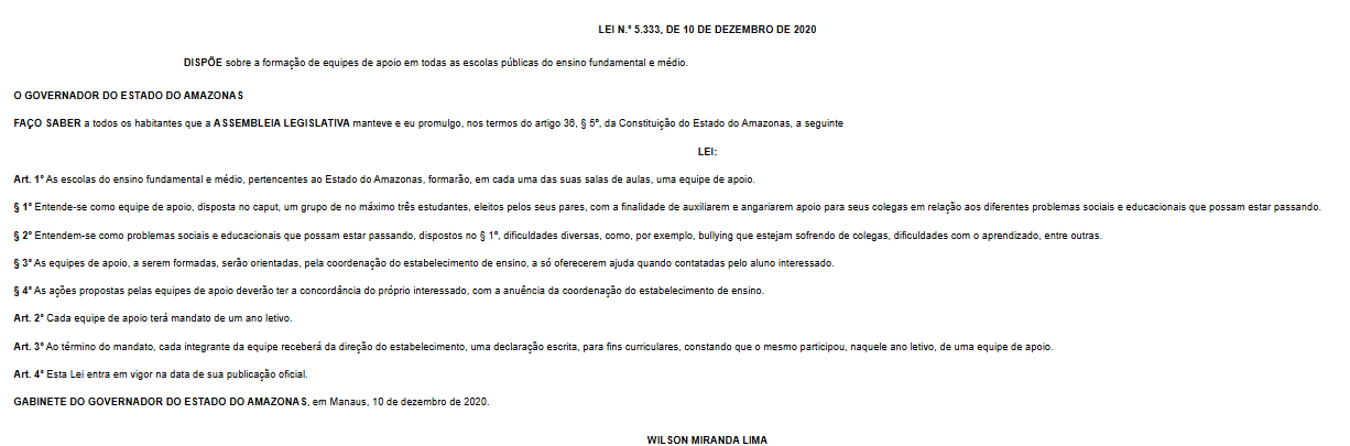 Já a Lei nº 5.333/2020, estabelece a formação de equipes de apoio em todas as escolas públicas do ensino fundamental e médio;