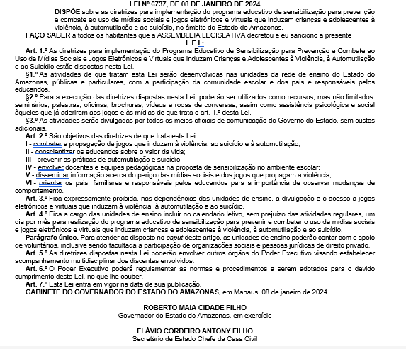 E a Lei nº 6.737/2024, que autoriza o Poder Executivo a desenvolver um programa educativo de sensibilização para prevenção e combate ao uso de mídias sociais e jogos eletrônicos e virtuais que induzam crianças e adolescentes à violência, à automutilação e ao suicídio.