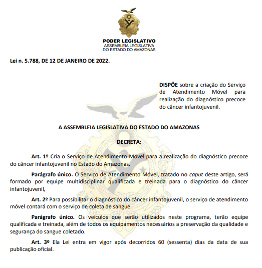 Da nº 5.788/2022, que cria o Serviço de Atendimento Móvel para realização do diagnóstico precoce do câncer infantojuvenil;