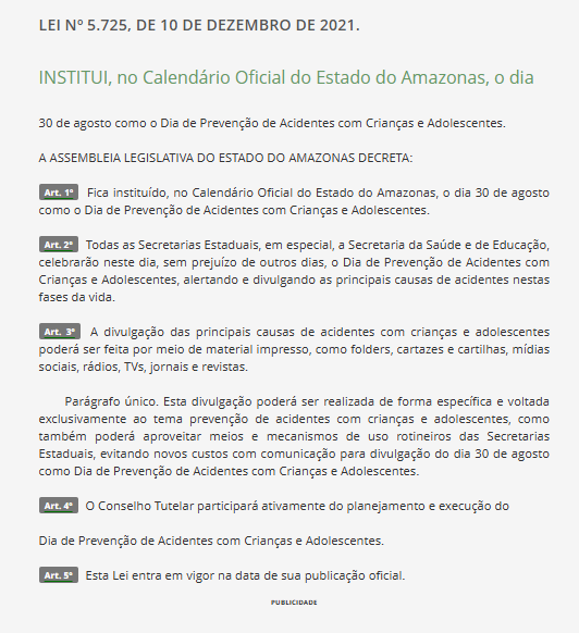 Da nº 5.725/2021, que estabelece no calendário oficial do Estado o dia 30 de agosto como o Dia De Prevenção de Acidentes com Crianças e Adolescentes;