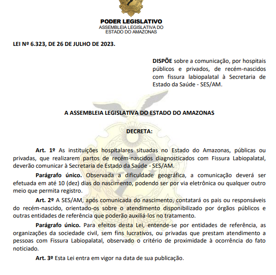 E da nº 6.323/2023, que obriga os hospitais públicos e privados a comunicarem à Secretaria de Estado da Saúde (SES/AM) sobre a presença de recém-nascidos com fissura labiopalatal.