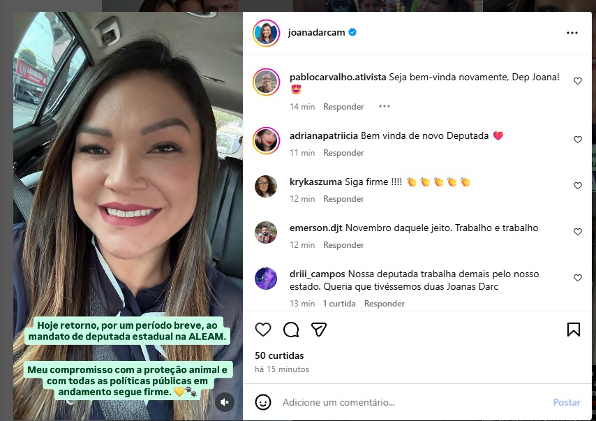 Até a publicação desta matéria, Joana apenas publicou uma foto com a legenda: “Hoje retorno, por um período breve, ao mandato de deputada estadual na Aleam”.