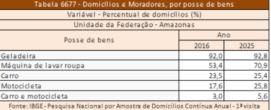 O acesso a bens dentro das casas no Amazonas aumentou nos últimos anos, segundo dados da PNAD Contínua, do Instituto Brasileiro de Geografia e Estatística (IBGE), divulgados nesta sexta-feira (17). O crescimento aparece principalmente em itens como geladeira, máquina de lavar e motocicleta.