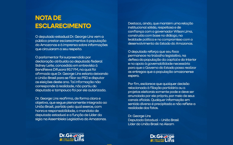Na nota, o parlamentar reafirma que segue plenamente integrado ao União Brasil, partido pelo qual exerce o mandato de deputado estadual e a função de líder da sigla na Assembleia Legislativa do Amazonas (Aleam). Ele destacou que atua com “honra e responsabilidade” na legenda.