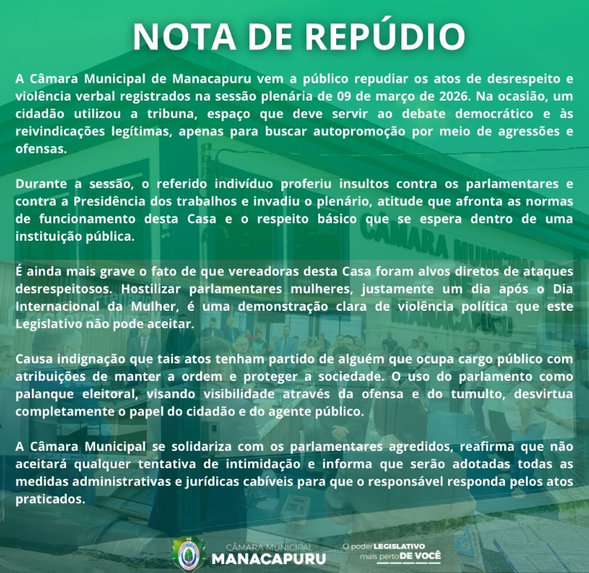 “Causa indignação que tais atos tenham partido de alguém que ocupa cargo público com atribuições de manter a ordem e proteger a sociedade. O uso do parlamento como palanque eleitoral, visando visibilidade através da ofensa e do tumulto, desvirtua completamente o papel do cidadão e do agente público, diz nota de repúdio da Mesa Diretora da Câmara de Manacapuru.