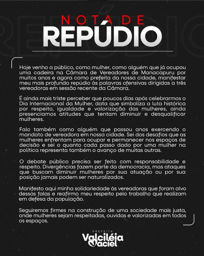 Assim que soube dos ataques à atuação das vereadoras, Valcileia Maciel também divulgou uma nota em solidariedade e destacou que as falas ofensivas foram proferidas no mês das mulheres e muito próximo do Dia Internacional dedicado a elas.