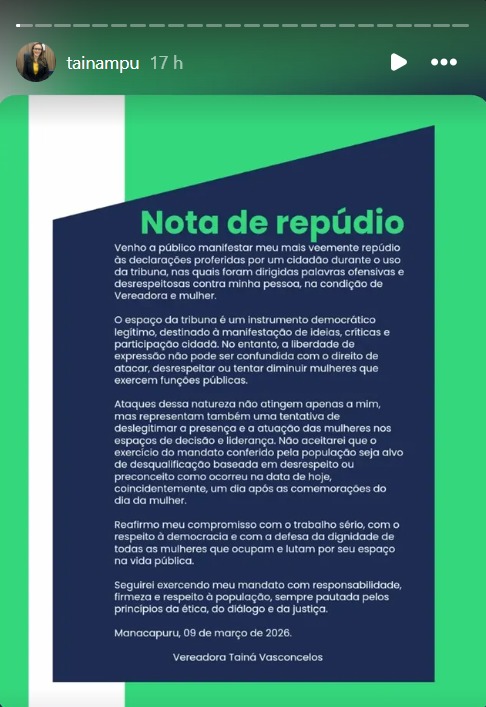 A vereadora Tainá Vasconcelos (PSD) divulgou uma nota de repúdio contra as atitudes de Rizannio, cuja atuação pública no município é marcada por ataques contra a prefeita Valciléia Maciel (MDB).