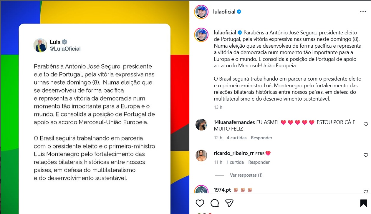 O presidente Luiz Inácio Lula da Silva parabenizou neste domingo (8/2) o socialista António José Seguro pela vitória na eleição presidencial de Portugal. Em mensagem pública, Lula destacou a importância do resultado para a democracia portuguesa e afirmou que a eleição reforça os laços históricos, políticos e culturais entre Brasil e Portugal, além de sinalizar a continuidade do diálogo e da cooperação entre os dois países.