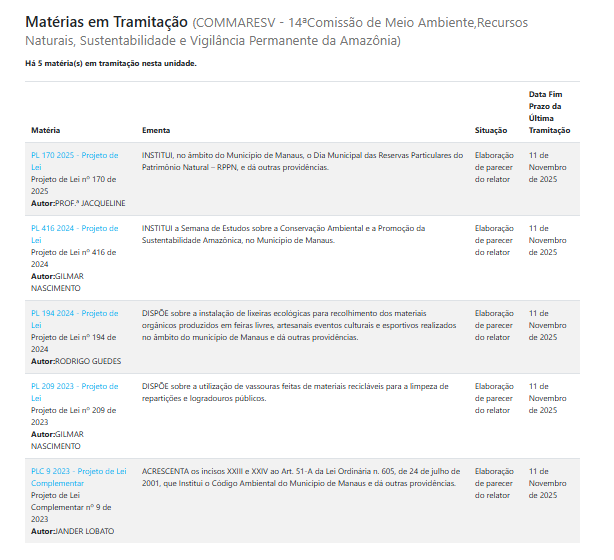 A Comissão de Meio Ambiente, Recursos Naturais, Sustentabilidade e Vigilância Permanente da Amazônia, da Câmara Municipal de Manaus (CMM), é presidida pelo vereador Jaildo Oliveira (PV). No caso da atuação da Comissão, o SAPL mostra que existem 5 matérias em tramitação nela, dos autores: Professora Jacqueline (UB), Gilmar Nascimento (Avante), Rodrigo Guedes (PP) e Jander Lobato (PSD).