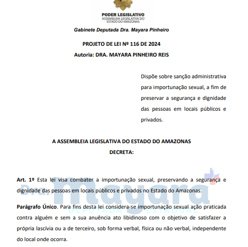 A Assembleia Legislativa do Amazonas (Aleam) aprovou o Projeto de Lei da deputada estadual Dra. Mayara Pinheiro (Republicanos) que estabelece multas de até R$ 10 mil para casos de importunação sexual ocorridos em locais públicos e privados do estado. A proposta segue agora para sanção governamental.
