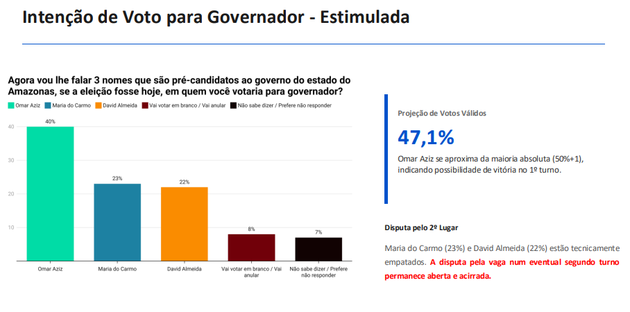 De acordo com a pesquisa feita pela empresa Comunidados realizada entre os dias 15 e 19 de dezembro com 2.000 eleitores, Omar Aziz (PSD) segue na liderança isolada da corrida pelo Governo do Amazonas. No cenário estimulado, o senador soma 40% das intenções de voto. Quando considerados apenas os votos válidos, o percentual chega a 47,1%, colocando Aziz próximo da maioria absoluta necessária para vencer ainda no primeiro turno, segundo o levantamento.