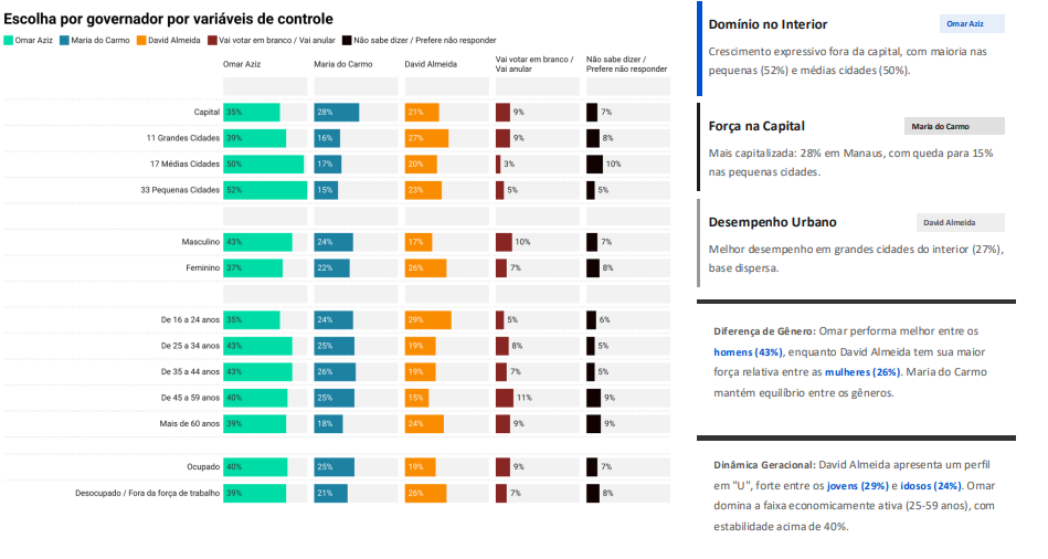 Os dados por recorte regional mostram que a força de Aziz está concentrada principalmente fora da capital. Ele lidera com 52% nas pequenas cidades e com 50% nas médias, além de alcançar 39% nas grandes cidades do interior. Em Manaus, o ex-governador também aparece na frente de outros pré-candidatos, com 35% das intenções de voto.