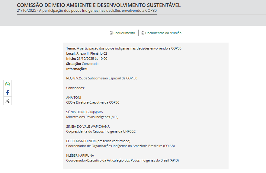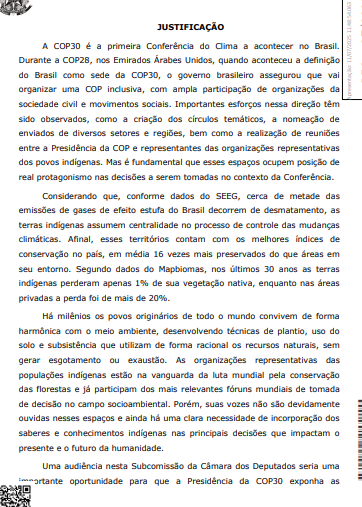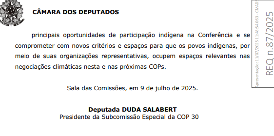 No requerimento que solicita a realização da Audiência Pública para discussão do tema, Duda Salabert destaca que os povos indígenas possam ocupar espaços relevantes nas negociações climáticas nesta (COP30, em Belém) e nas próximas COPs.