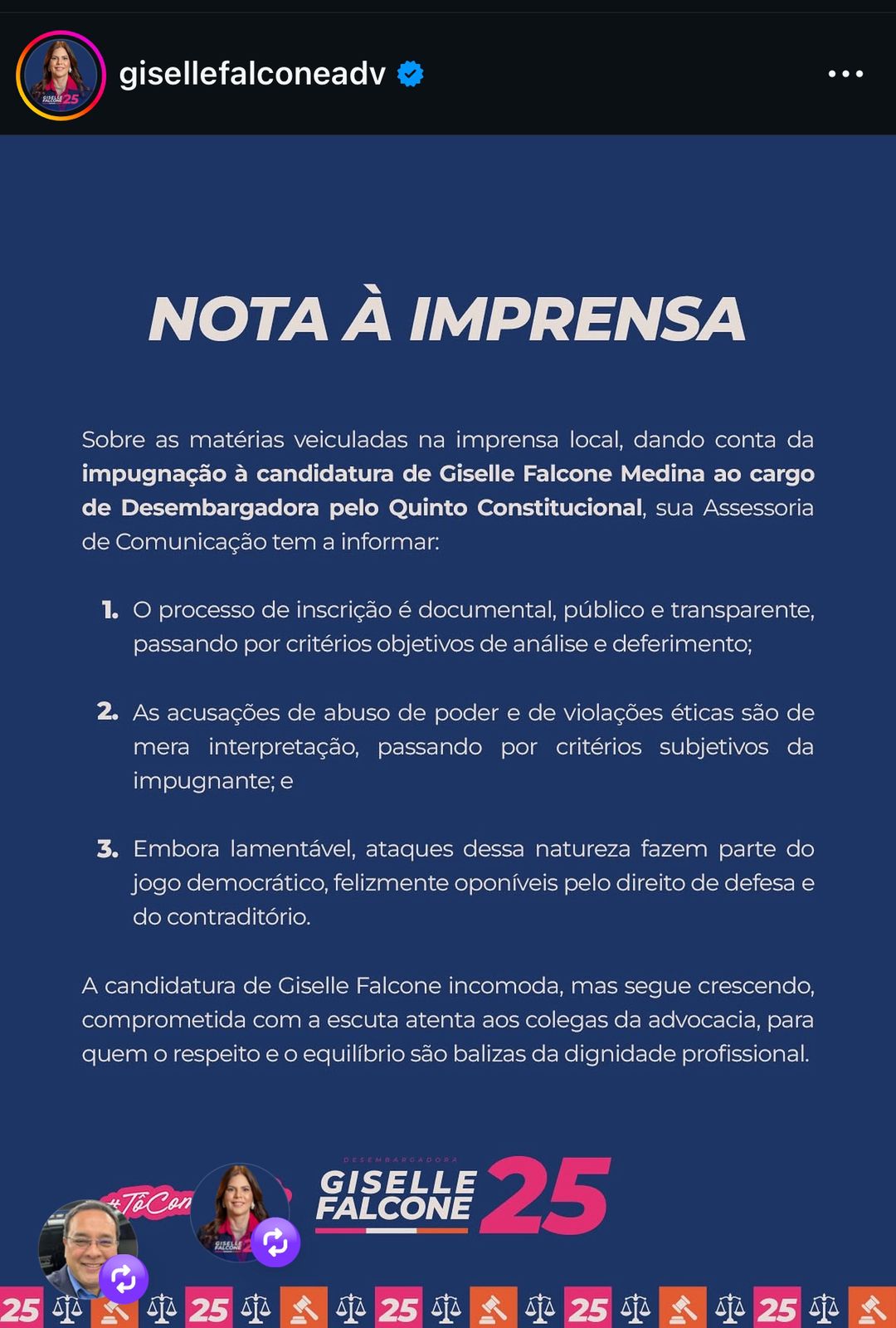 Em resposta, Giselle Falcone se manifestou pelas redes sociais na noite de terça-feira (18/11), contestando os argumentos apresentados por Caroline Frota. A candidata declarou que, apesar de desgastantes, pedidos de impugnação fazem parte do processo democrático e afirmou que apresentará as documentações necessárias à comissão.