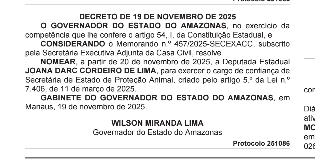 O governo do Estado do Amazonas, por meio de decreto datado de 19 de novembro de 2025, nomeou a deputada estadual Joana Darc Cordeiro de Lima, mais conhecida como Joana Darc, para assumir, a partir de 20 de novembro, o cargo de Secretária de Estado de Proteção Animal. A pasta foi criada pelo artigo 5.º da Lei n.º 7.406, de 11 de março de 2025.