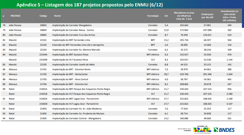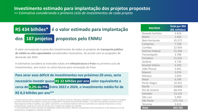 O ENMU prevê 187 projetos em 21 regiões metropolitanas, com investimentos que podem ultrapassar R$ 430 bilhões até 2054.