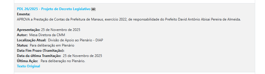 O PDL nº 026/2025 trata da prestação de contas de 2022. O texto acompanha o parecer prévio do Tribunal de Contas do Estado do Amazonas (TCE-AM), que recomendou a aprovação com ressalvas, conforme o Acórdão nº 43/2025. O parecer foi aprovado por unanimidade pelo colegiado do TCE, que encaminhou o processo à Câmara conforme previsto na Constituição Estadual.
