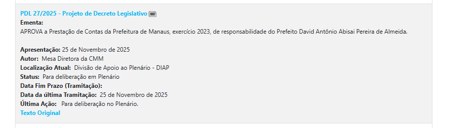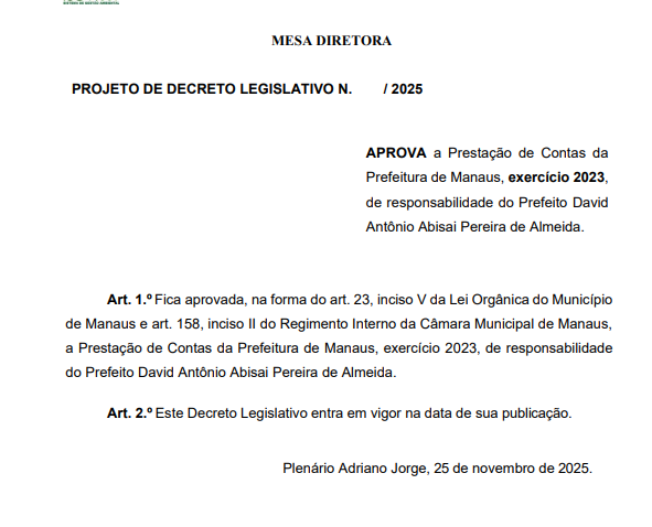 Já o PDL nº 027/2025 dispõe sobre a prestação de contas referente ao exercício de 2023. Também neste caso, o TCE-AM emitiu parecer prévio favorável, com ressalvas, registrado no Acórdão nº 44/2025. O processo, com mais de 257 mil páginas, também está disponível para consulta no sistema de acompanhamento processual do tribunal.