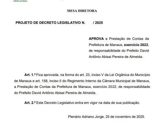 A Câmara Municipal de Manaus (CMM) recebeu, nesta terça-feira (25/11), dois Projetos de Decreto Legislativo (PDLs) que tratam da aprovação das prestações de contas da Prefeitura de Manaus referentes aos exercícios de 2022 e 2023, de responsabilidade do prefeito David Almeida (Avante). As matérias, protocoladas pela Mesa Diretora, foram deliberadas em sessão plenária desta quarta-feira (26/11), seguindo para a Comissão de Constituição, Justiça e Redação (CCJR).