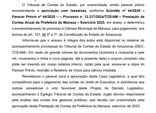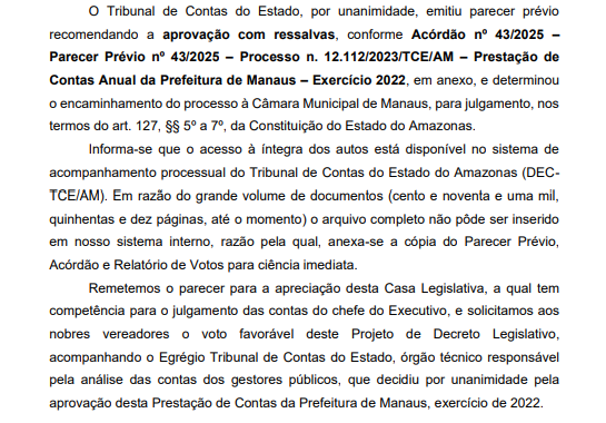 Resumindo, em ambos os projetos, a mesma linha de justificativa é usada: ressaltam que o julgamento das contas é prerrogativa privativa da Câmara e solicitam que os vereadores acompanhem o entendimento técnico do TCE-AM, órgão responsável pela análise dos demonstrativos fiscais e da execução orçamentária da Prefeitura.